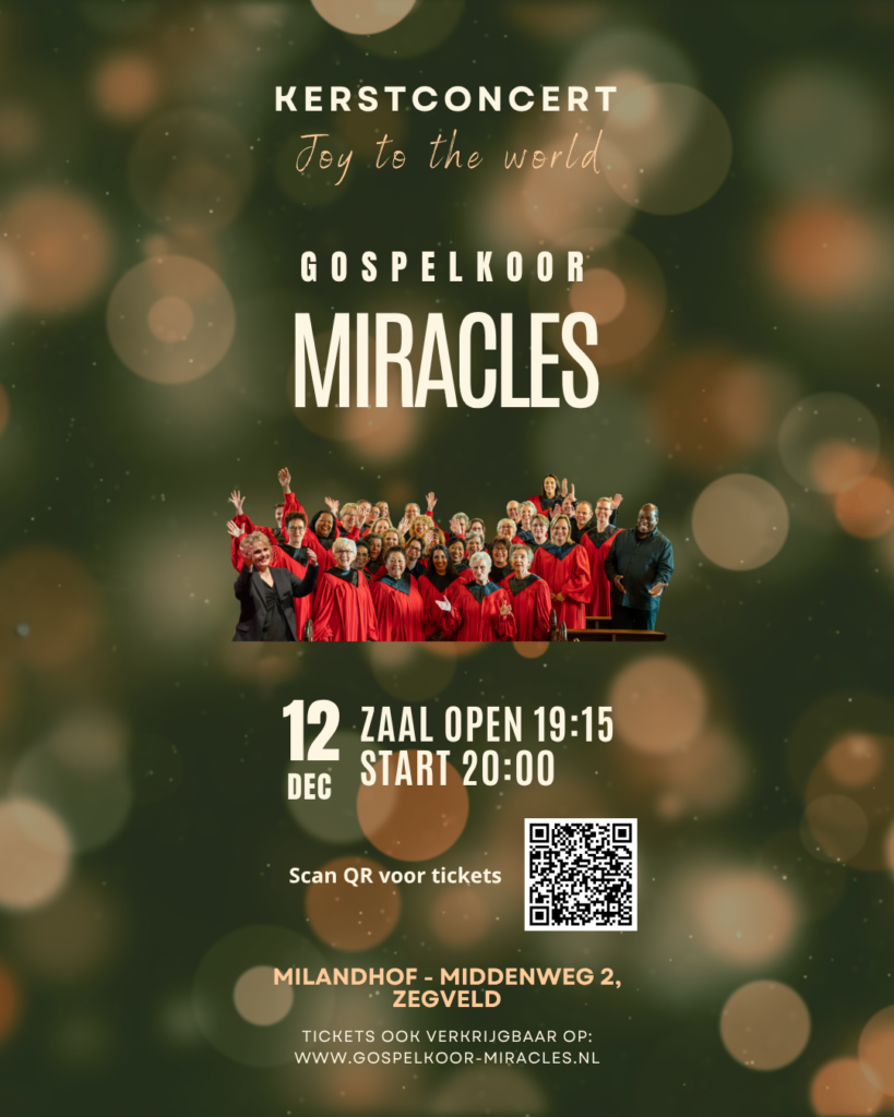 Op vrijdag 12 december verandert de Milandhof in Zegveld in een warme sfeervol kerstdecor voor het bijzondere kerstconcert van gospelkoor Miracles ‘Joy tot the World’ Onder leiding van dirigent Iris de Jong en wordt begeleid door een liveband met onder meer Yvonne Leeftink op piano en Pat Winterdal op bas.
